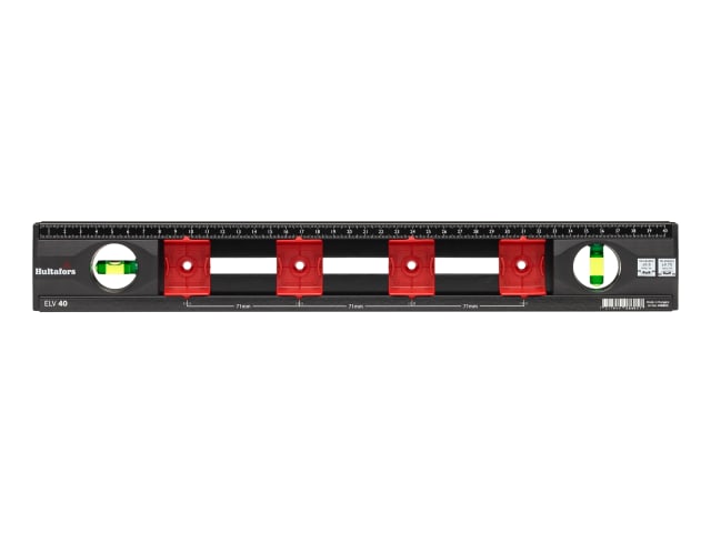 The Hultafors ELV 40 Spirit Level for electrical installations. The C-shaped aluminium profile has plastic end pieces and rubber spacers protecting and prevent the spirit level from sliding on the measuring surface. Sliding markers with graded 71mm centre spacing, allows for quick and accurate positioning when installing switch or junction boxes according to DIN 49075.