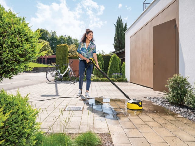 The Kärcher T5 T-Racer Surface Cleaner has a twin-jet rotating arm that is capable of removing dirt from large outside areas. Cleans in around half the time of a spray lance. Ultra practical: the nozzle is repositioned depending on the surface being cleaned. This means that hard surfaces, such as stone and concrete, can be cleaned just as effectively as more delicate surfaces, such as wood.