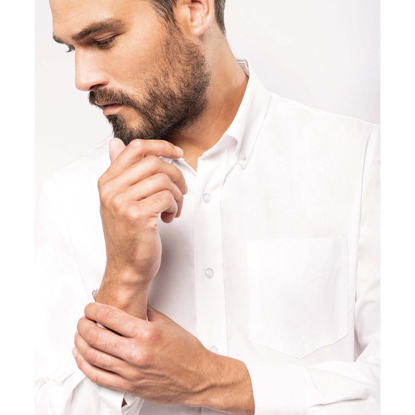70% Oxford cotton/30% polyester. Easy-care fabric. Button down collar. Matching buttons. V-shaped left chest pocket. Double back yoke with 2 side pleats. Adjustable rounded button cuffs with button placket. 2 spare buttons. Shaped hem. Certified STANDARD 100 by OEKO-TEX® N° CQ 1007/7, IFTH.