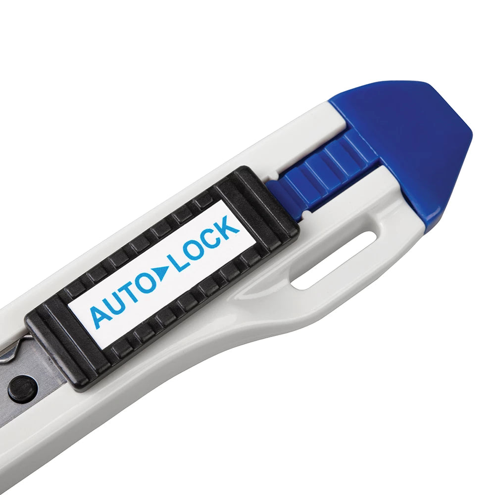 Auto-locking safety knife with break-off blades and 2 blades stored in the handle. Plastic-covered metal case. Blade width 9mm. Overall length 142mm.