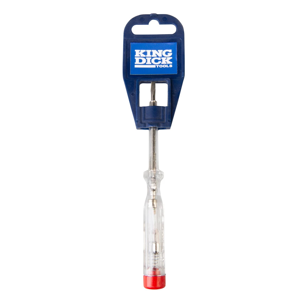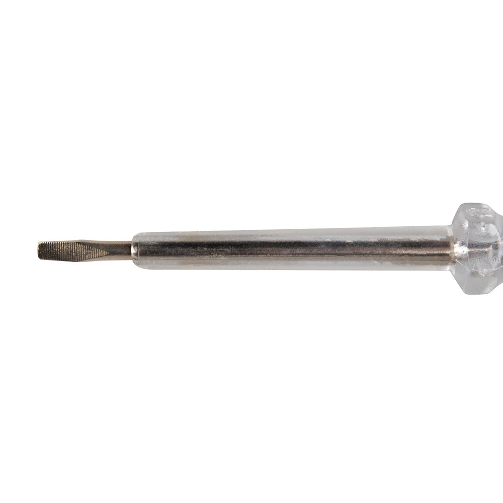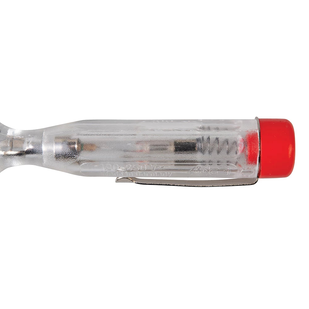 Chrome vanadium-molybdenum steel blade with transparent sheath. Heat-treated and chrome-plated finish for corrosion resistance. Transparent handle illuminates when voltage is detected. Voltage range: 150 – 250V. Complies with VDE 0680/06 and DIN57680/6.