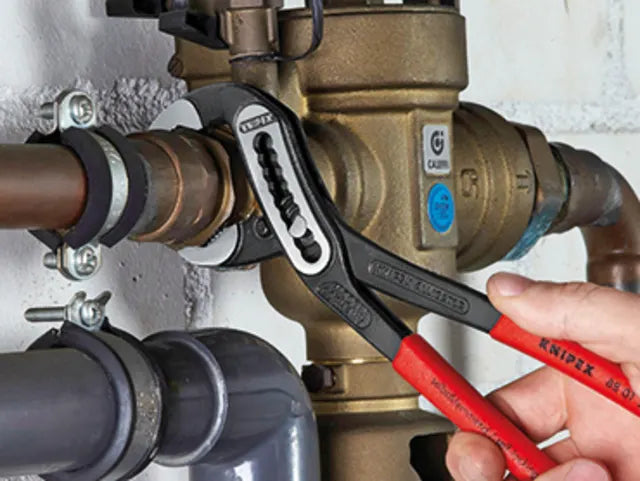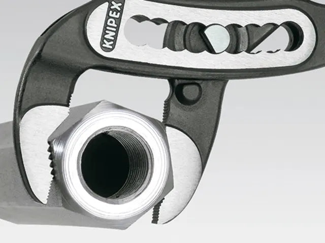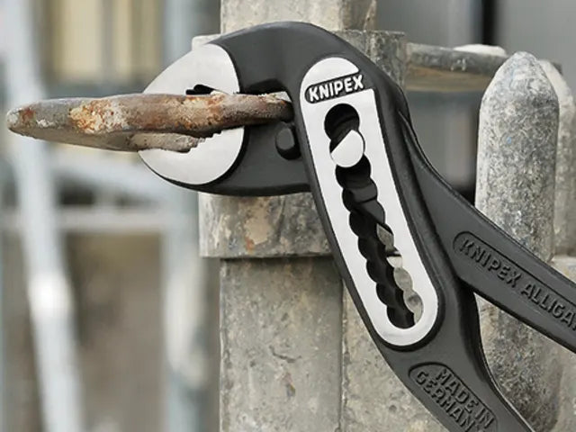 The Knipex 88 01 Series Alligator® Water Pump Pliers with dipped PVC handles and a box joint design prevents slipping from the workpiece. The gripping surfaces have special hardened teeth to approx. 61 HRC offering high wear resistance and stable gripping. They are made from chrome vanadium electric steel, that has been oil-hardened.