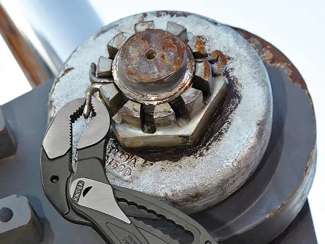 They offer more output and comfort compared to conventional water pump pliers of the same length and have a 9-notch adjustment positioning for 30 % more gripping capacity. The slim design of the head and joint area provide good access to the work piece and self-locking on pipes and nuts means no slipping on the work piece and low hand force required.