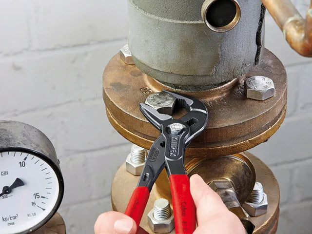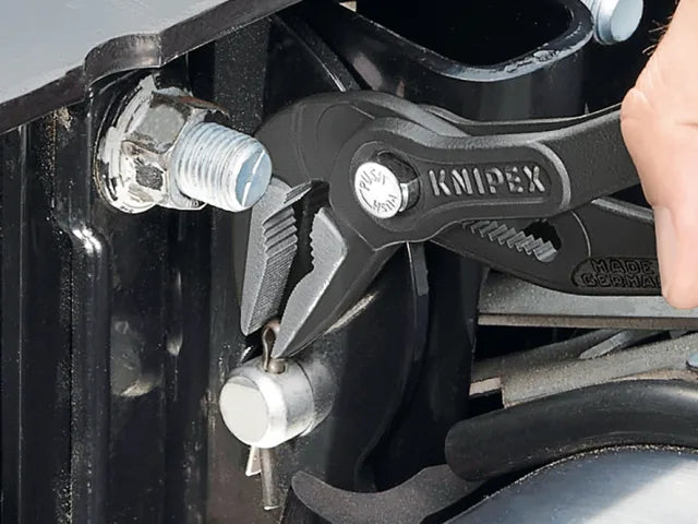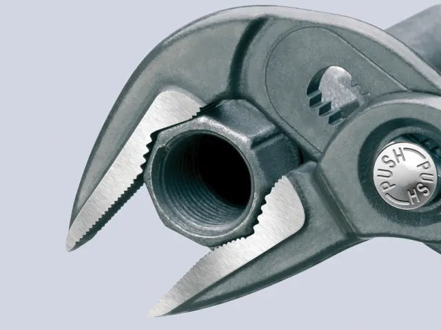These Knipex 8751250 extra slim Cobra Water Pump Pliers have automatic adjustment and they can be opened and adjusted directly at the workpiece with one hand. The handles incorporate a multi-purpose press button for fine fitting directly onto the workpiece. The extra long narrow jaws provide good access.