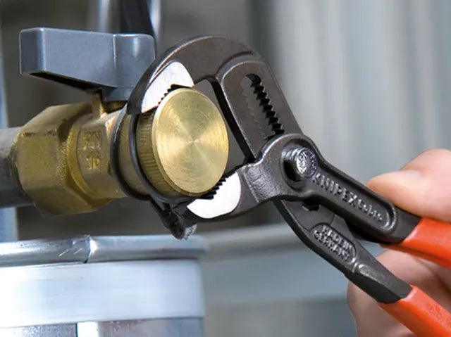 The Knipex 87 01 Cobra® Series Water Pump Pliers are made from chrome vanadium electric steel, which has been forged and multi-stage oil-hardened for excellent durability. The gripping surfaces have special hardened teeth, with hardness approx. 61 HRC to ensure high wear resistance and stable gripping. A press-button action allows fast and firm adjustment directly on the workpiece.