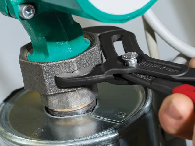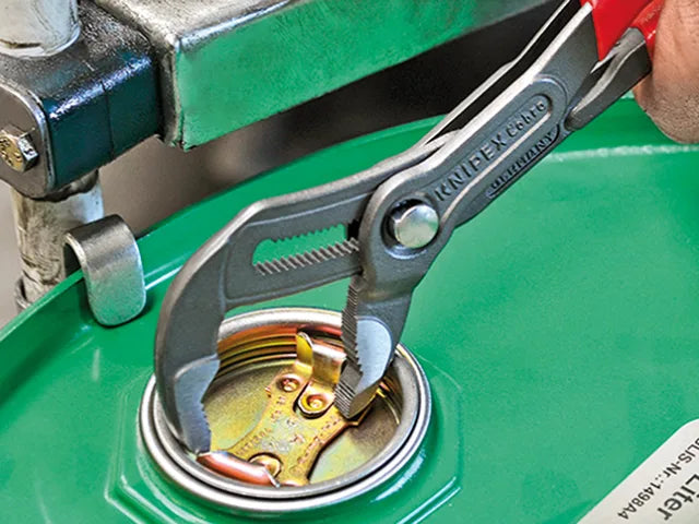 The Knipex 87 01 Cobra® Series Water Pump Pliers are made from chrome vanadium electric steel, which has been forged and multi-stage oil-hardened for excellent durability. The gripping surfaces have special hardened teeth, with hardness approx. 61 HRC to ensure high wear resistance and stable gripping. A press-button action allows fast and firm adjustment directly on the workpiece.