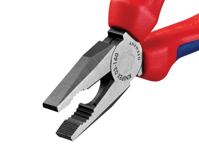 Knipex 03 02 Series Combination Pliers with 2 component, soft-grip handles. Made from special tool steel, forged, multi stage oil-hardened. With gripping zones for flat and round material, suitable for versatile use. They also feature cutting edges for soft and hard wire and long cutting edges for thicker cables. These cutting edges have been additionally induction-hardened, hardness approx. 60 HRC.