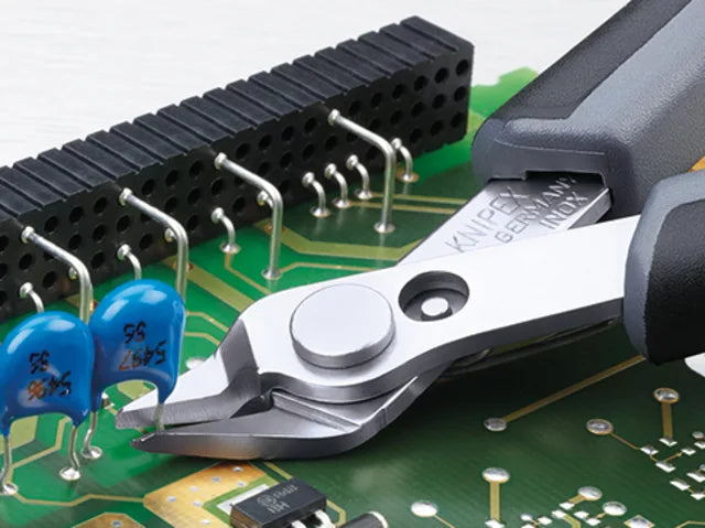 Knipex 78 03 Series Electronic Super Knips® are fitted with electrically discharging handles (dissipative). Ground, very sharp cutting edges without bevel, cutting edge hardness approx. 54 HRC. The precisely shaped tips cut wires close to a surface from Ø 0.2mm. Suitable for ultra fine cutting work, eg: in electronics and fine mechanics.