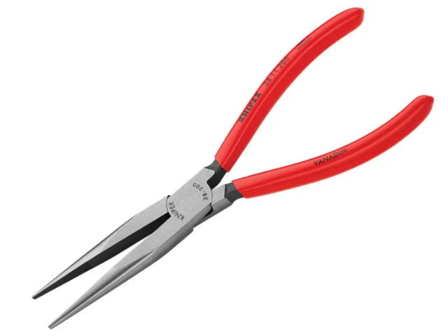 These Knipex 38 11 Mechanics Long Nose Pliers with straight, flat-round jaws and a polished head. Made from special tool steel that has been oil hardened to give these pliers a longer working life. ;Fitted with ;PVC dipped handles for added comfort, durability and, most importantly, added grip. The gripping surfaces cross-hatched and knurled. The cutting edges are separately induction hardened for durability and longer working life and are hardened to approx 61HRc.