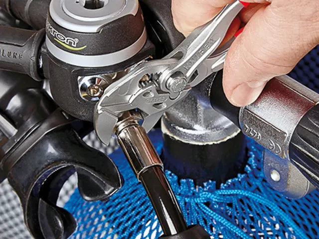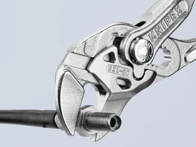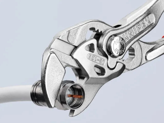 Combines pliers and a wrench in a single tool and replaces the need for sets of metric and imperial spanners. Fitted with smooth jaws for damage free installation of plated fittings, allowing you to work directly on chrome. Reliable catching of the hinge bolt: no unintentional shifting. The ratchet type principle allows quick and easy tightening and release of all bolted connections.