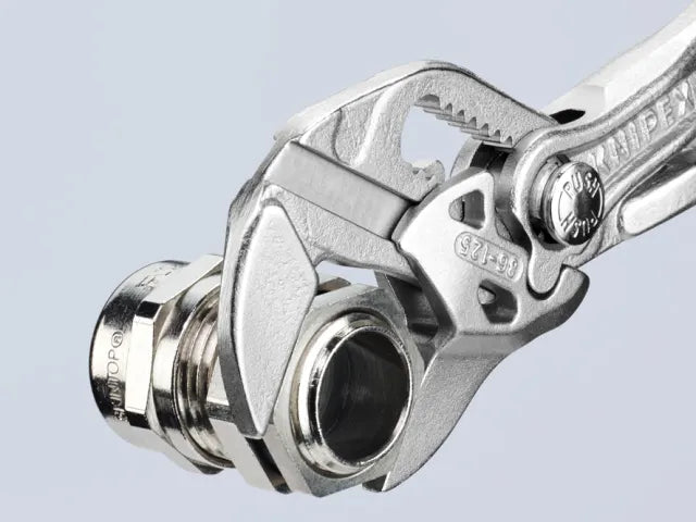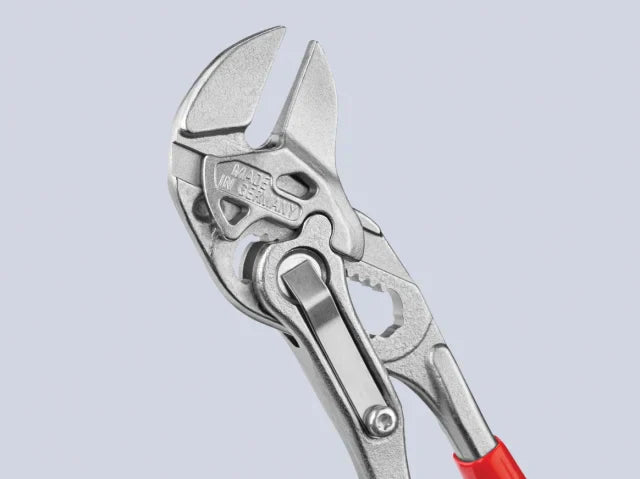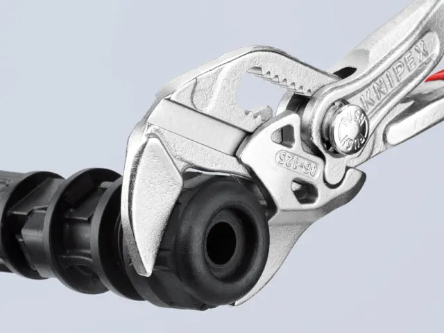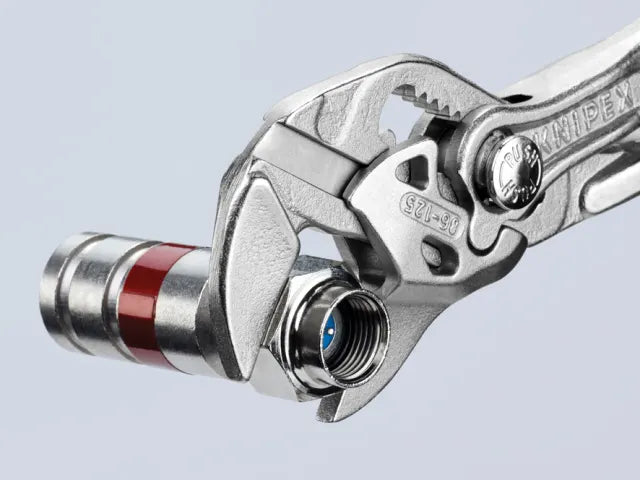 The Knipex 86 03 Series Pliers Wrench with dipped PVC handles and smooth parallel jaws for cautious installation of plated fittings or sensitive surfaces. More effective, faster and greater capacity than an adjustable spanner of the same size.