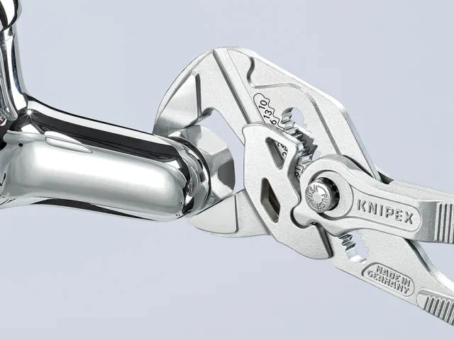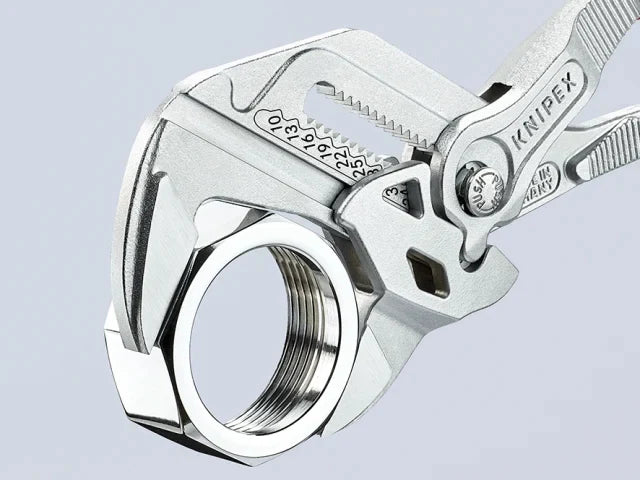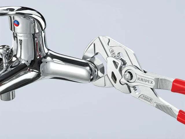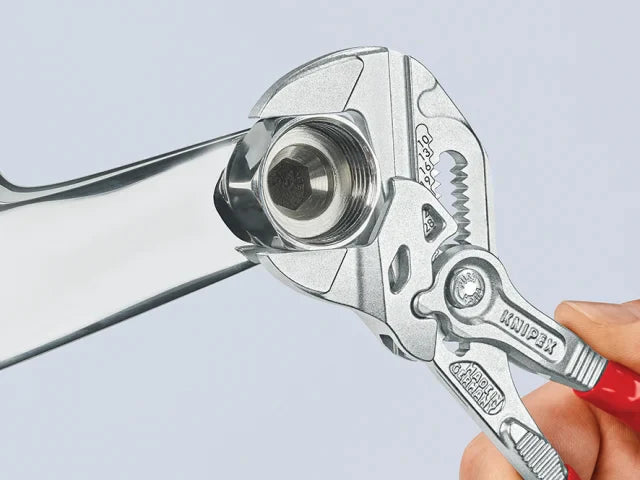 The Knipex 86 03 Series Pliers Wrench with dipped PVC handles and smooth parallel jaws for cautious installation of plated fittings or sensitive surfaces. More effective, faster and greater capacity than an adjustable spanner of the same size.