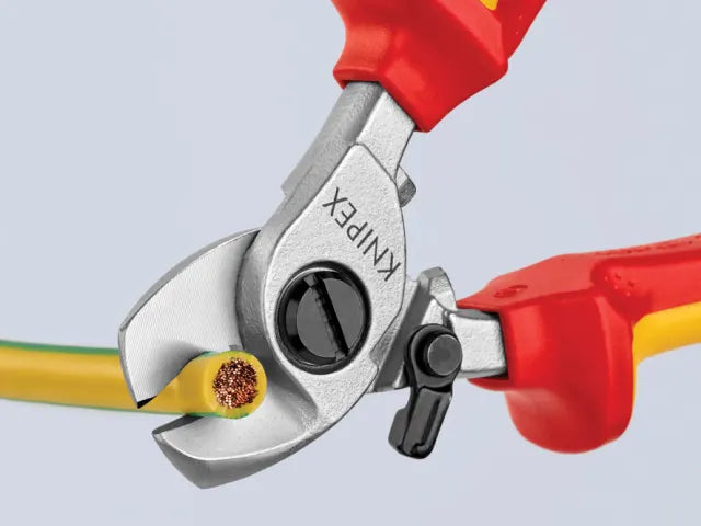 The Knipex 95 Series Cable Shears are fitted with multi-component grips, VDE tested up to 10,000V and safe for work up to 1,000V. They conform to DIN EN / IEC 60900. For cutting copper and aluminium cables without crushing or deforming as well as multiple stranded cables. Not suitable for steel wire and hard drawn copper conductors.