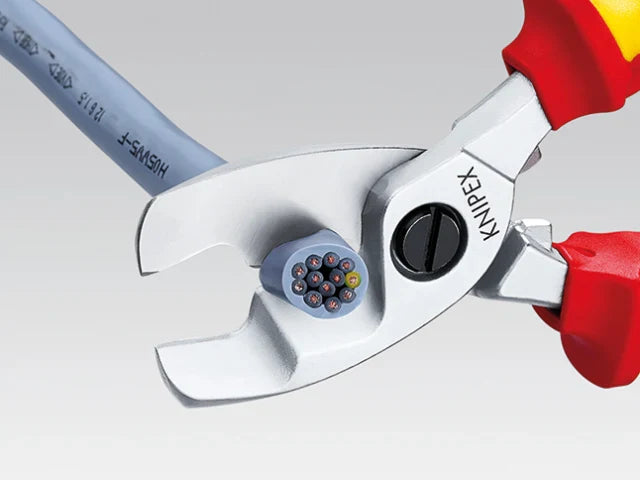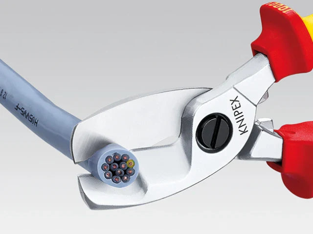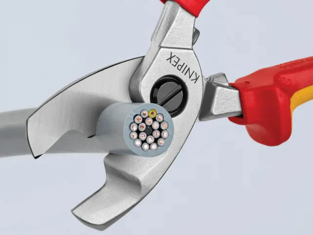 The Knipex 95 Series Cable Shears are fitted with multi-component grips, VDE tested up to 10,000V and safe for work up to 1,000V. They conform to DIN EN / IEC 60900. For cutting copper and aluminium cables without crushing or deforming as well as multiple stranded cables. Not suitable for steel wire and hard drawn copper conductors.