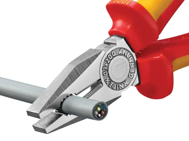 The Knipex 03 06 Series Traditional Combination Pliers with multi-component grips, VDE tested up to 10,000V and safe for work up to 1,000V. They conform to DIN EN / IEC 60900. Made from a top quality special tool steel, forged and oil-hardened to approximately 60 HRC for added strength and durability. Chrome plated finish. The jaws have longer cutting edges for thicker cables and gripping zones for flat and round materials.