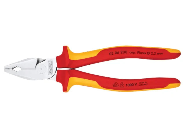 The Knipex 02 06 Series High Leverage Combination Pliers are fitted with multi-component grips, VDE tested up to 10,000V and safe for work up to 1,000V. They conform to DIN EN / IEC 60900. They require 35% less effort than with conventional combination pliers. Easier cutting, powerful gripping, bending and pulling due to optimised leverage.
