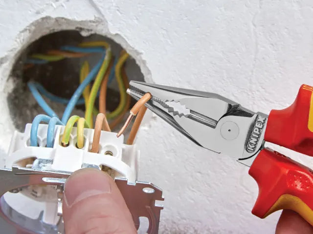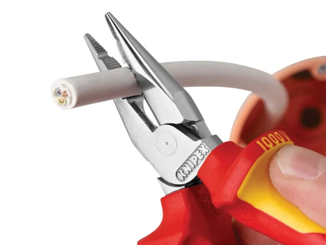 The Knipex 08-26 Series Needle Nose Combination Pliers are fitted with multi-component grips, VDE tested up to 10,000V and safe for work up to 1,000V. They conform to DIN EN / IEC 60900. Made from high-grade tool steel that has been forged and oil-hardened, multiple times. Chrome plated finish.