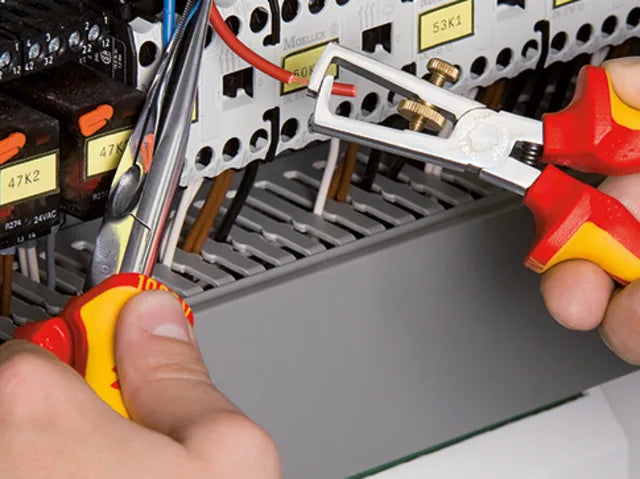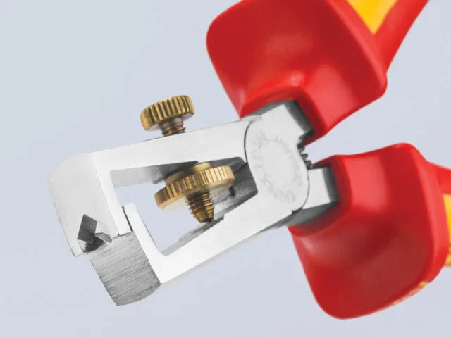 The Knipex 11 06 Series VDE Insulation Strippers are fitted with multi-component grips, VDE tested up to 10,000V and safe for work up to 1,000V. They conform to DIN EN / IEC 60900. Made from special tool steel, forged, oil-hardened. Chrome plated finish. Easy adjustment to the required diameter of solid or stranded wire with knurled screw and lock nut. For stripping single, multiple and fine stranded conductors with plastic or rubber insulation up to 5.0mm dia. or 10mm² cable cross-section.