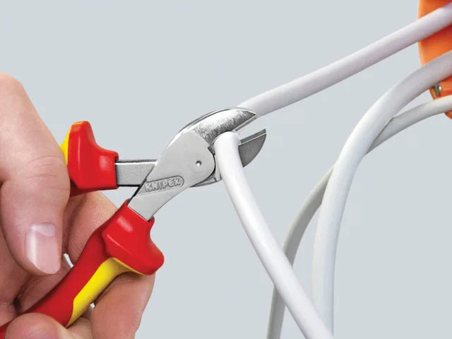 The Knipex 73-06 Series X-Cut Diagonal Cutters are fitted with multi-component grips, VDE tested up to 10,000V and safe for work up to 1,000V. They conform to DIN EN / IEC 60900. This box joint diagonal cutter is compact, light and simultaneously powerful and highly precise. With its wide range of cutting abilities, it offers versatility in industry, trades and crafts.