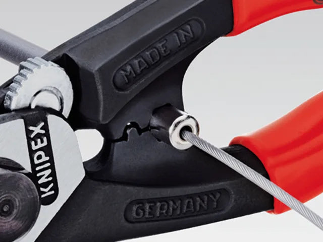 The Knipex 95 61 190 wire rope shears are ideal for medium-hard wire cables up to 7mm diameter without splaying, including those that are extremely strong, such as for example tyre cord. They also have two crimping dies for end caps on Bowden cable sheaths and end ferrules for traction cables and the blades are hardened to approximately 64HRC for added strength and durability