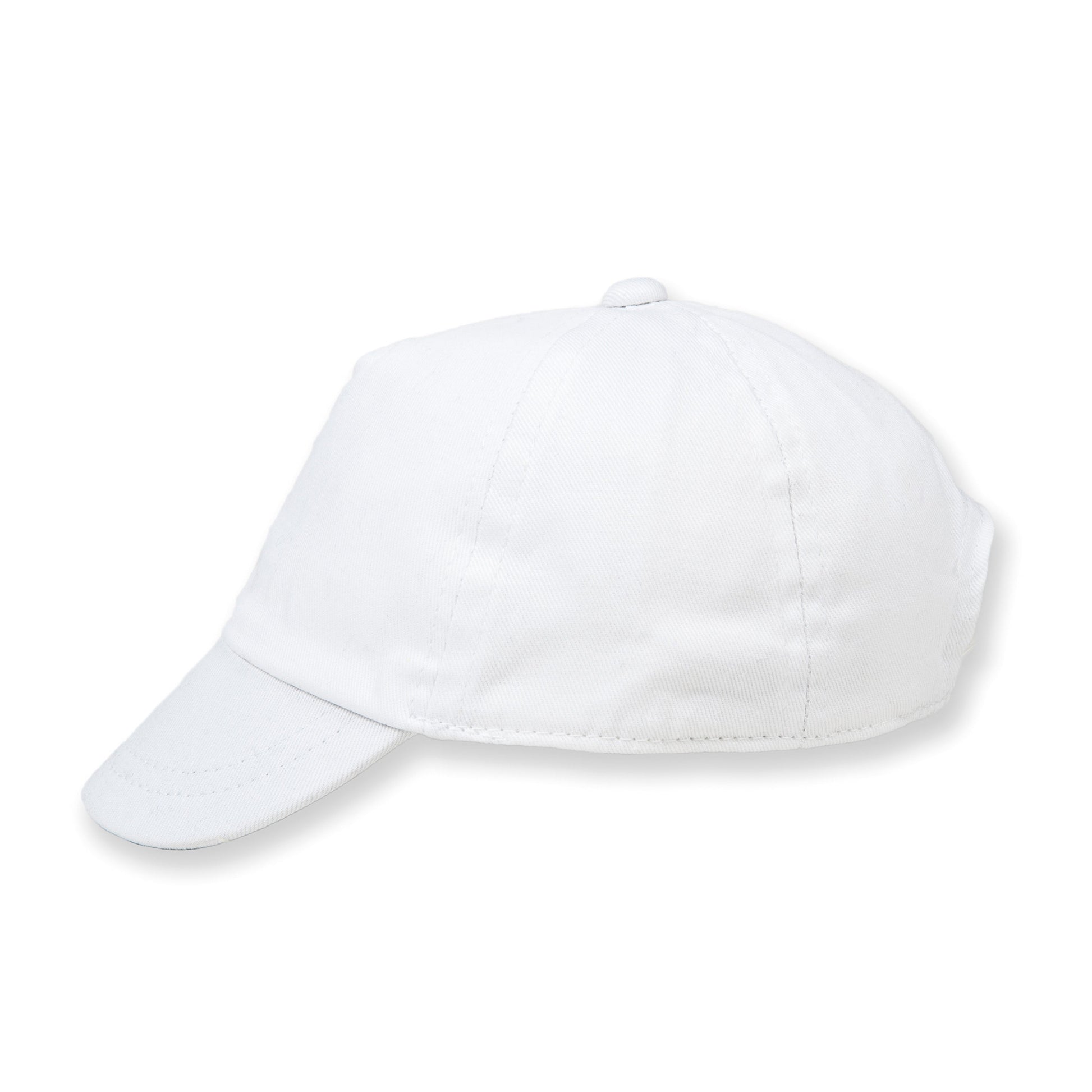 Cotton twill cap. Double front panel for easy decoration. Age 6-12 months, has a soft peak. BSCI certified. Oeko-Tex certified. SEDEX certified. WRAP certified.