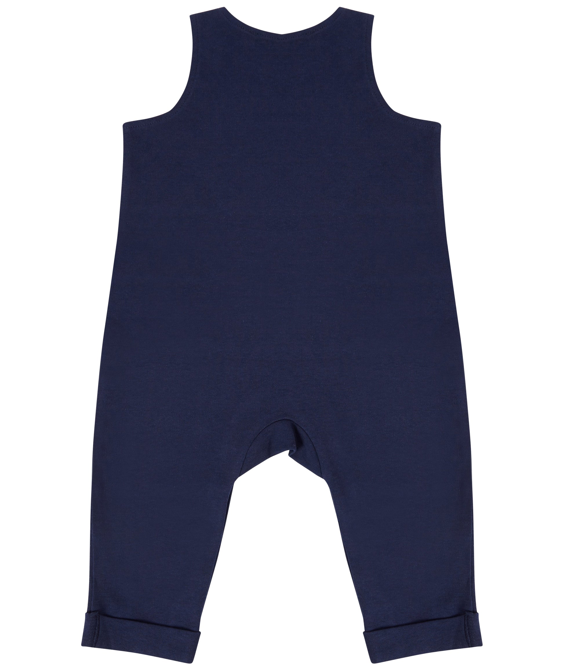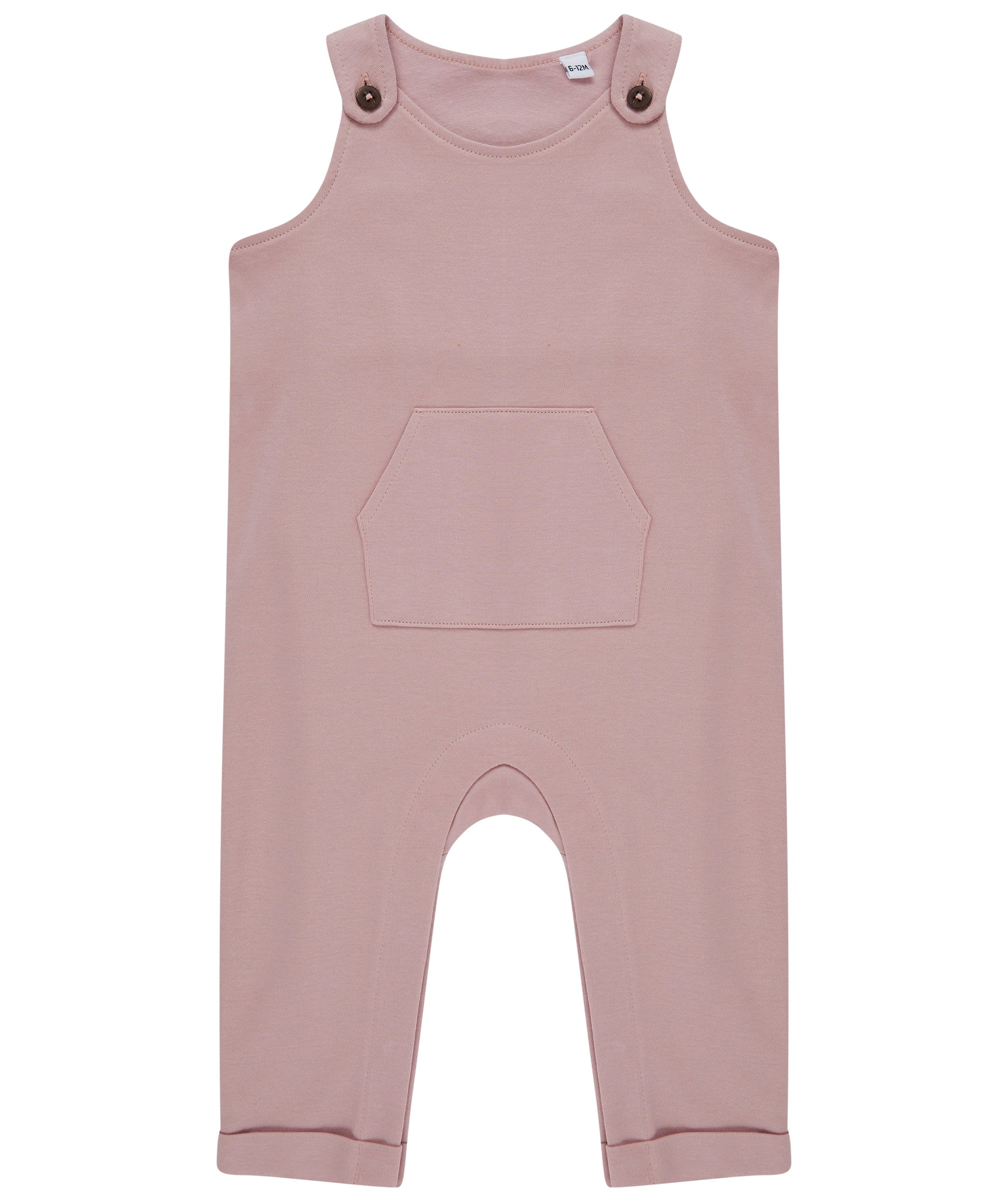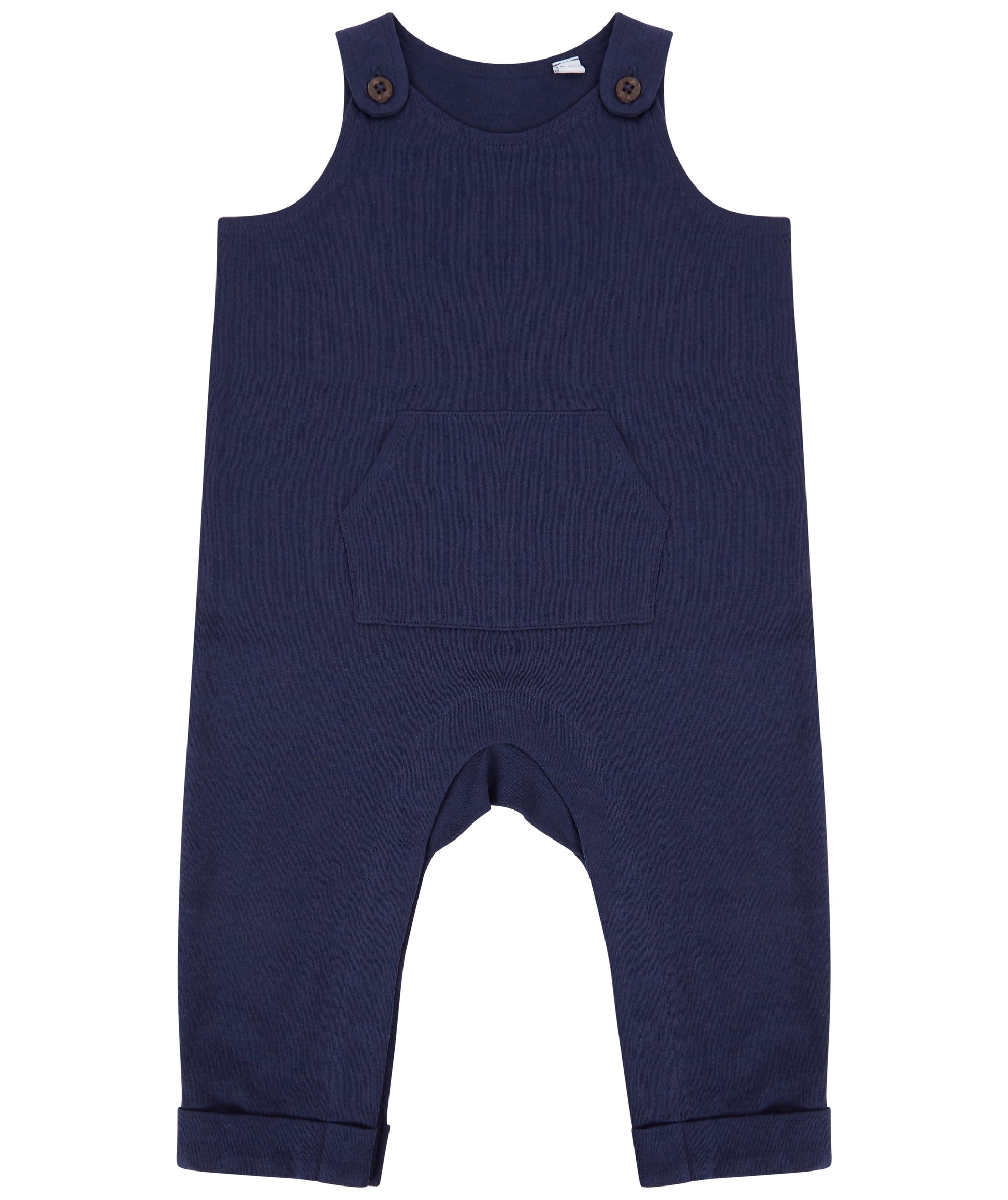 Cotton dungarees made in sustainable fabric with horn-button shoulder fastening. Central kangaroo pocket. Rolled and stitched leg hems with integral poppers around inseam. Single Jersey facing. Tag-free. BSCI certified. Oeko-Tex certified. SEDEX certified.