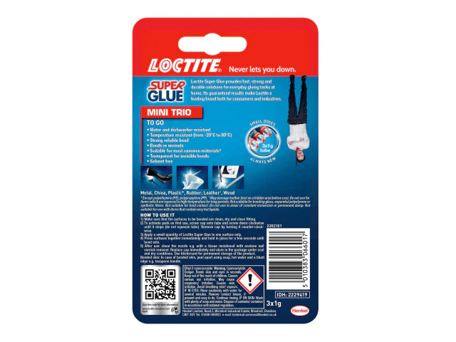 The Loctite Super Glue Original Mini Trio contains three one-shot tubes, so you're always ready for a quick repair job on the go! Convenient small-sized pipette. small enough to fit into any sized bag. This multi-purpose glue helps you to easily handle any kind of small daily repair job around the house.
