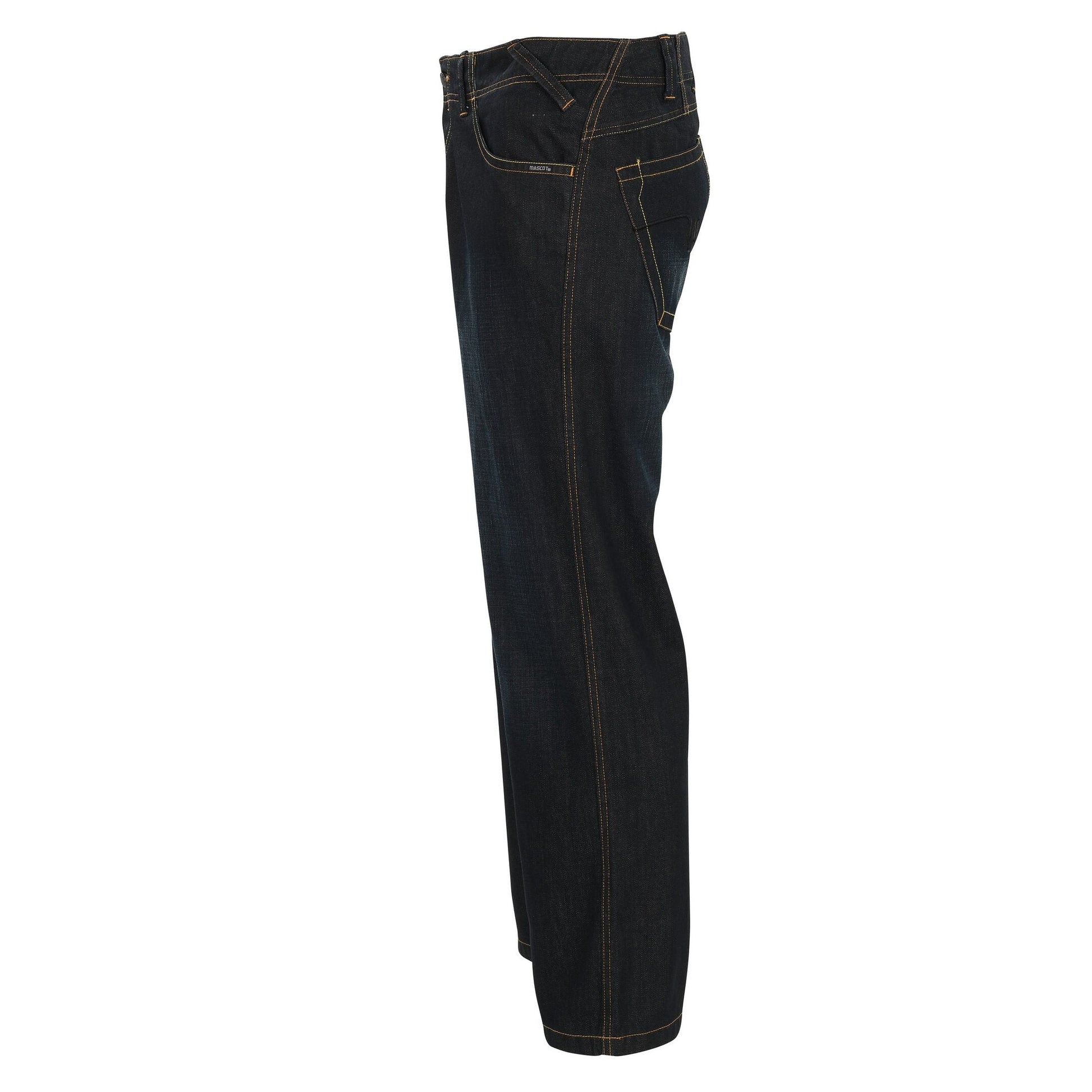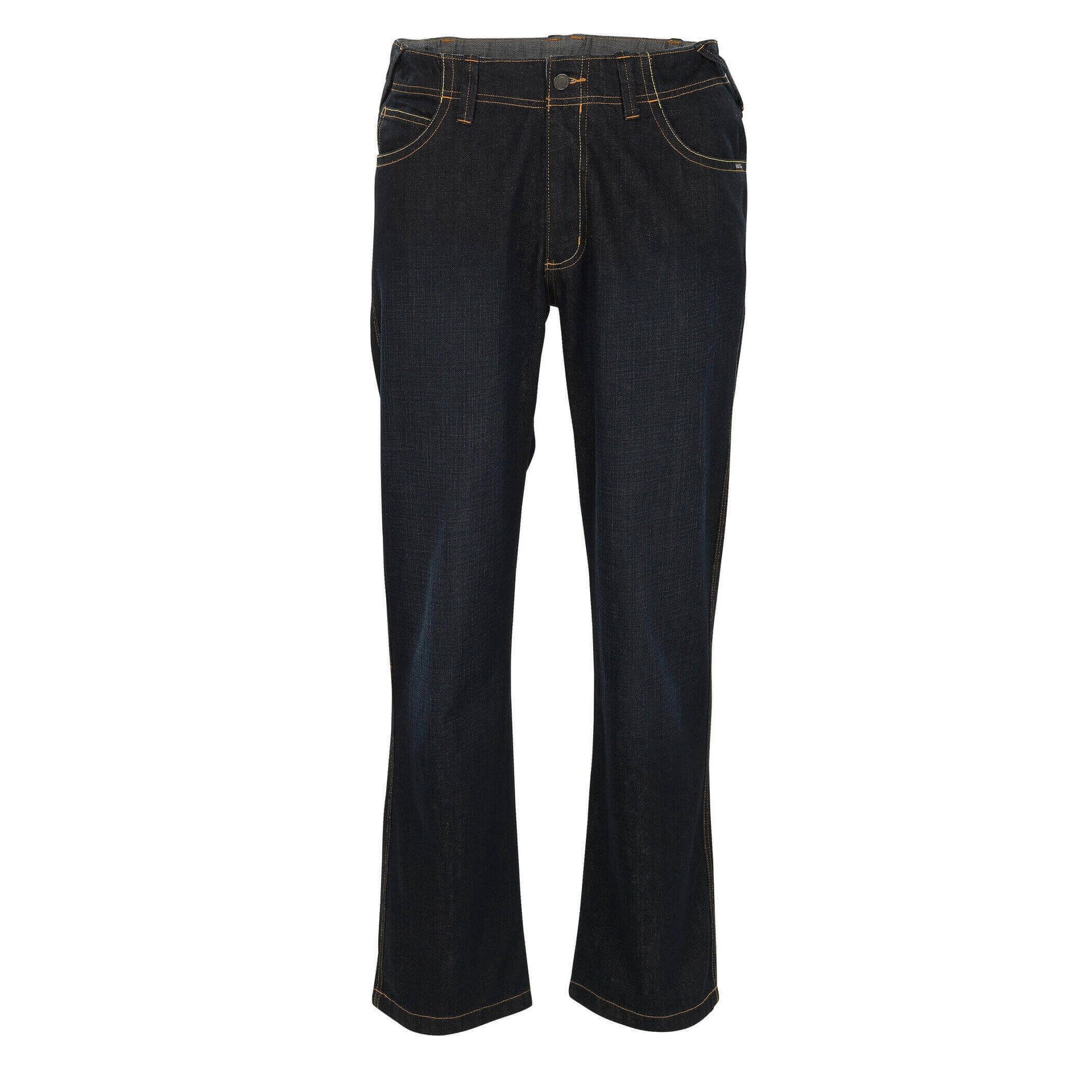 Durable work trousers featuring double-stitched seams on the legs and crotch for extra strength. Designed with a low waist and form-cut waistband to ensure comfort and freedom of movement. Includes a zip fly, front pockets, a coin pocket, and back pockets. Finished with distinctive orange and yellow contrast stitching.