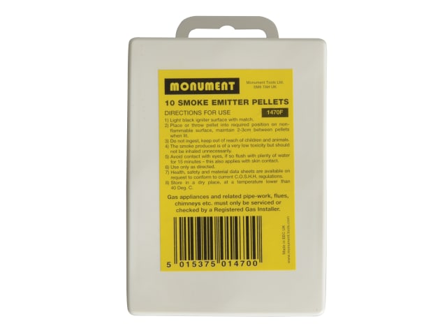 The Monument 1470F Smoke Emitter Pellets give off a dense white low-toxic smoke when ignited. They have a burn time of 60 seconds and have an approximate volume of 15m³.