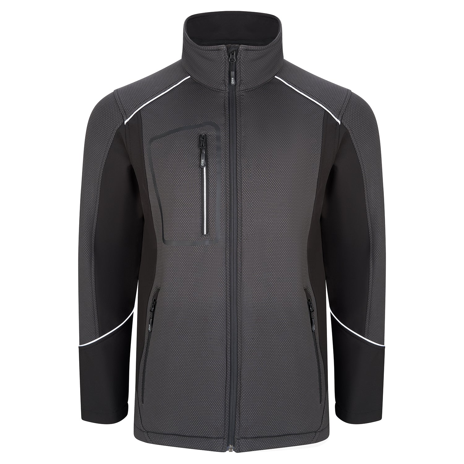 Technical stretch fabric with a hexagonal design, complimented with softshell panels and reflective piping.