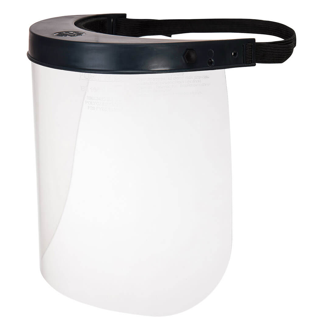 Lightweight low profile Browguard with clear visor. Fully certified to EN 166 optical class 1 for general industrial use. Fully adjustable with an elastic band for easy use and a soft sweatband included. Suitable for protection against light mechanical impacts, debris, fluid and liquid splashes.