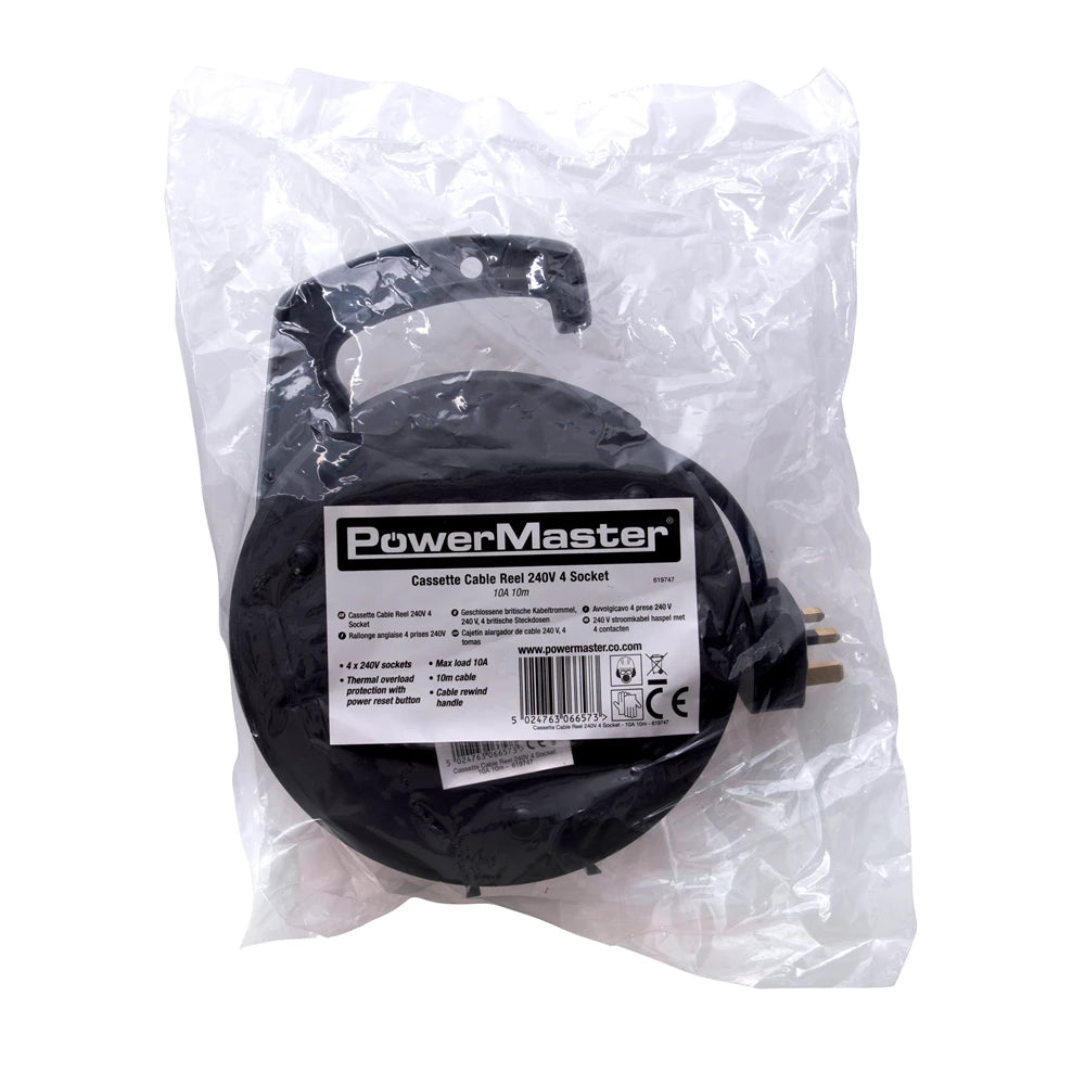 Thermal overload protection and power reset button. Cable rewind handle. 4 x BS drum-mounted sockets. Maximum load 10A. Cable length 10m.