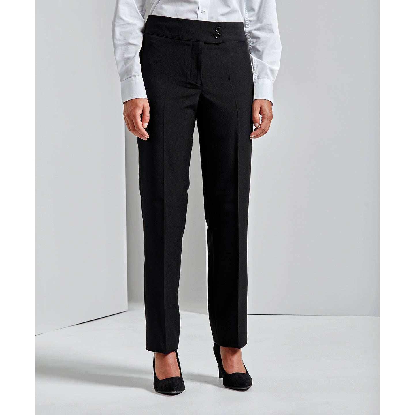 A straight leg trouser for women that features a deep waistband with cross-over tab and with two button fastening. Available in two leg lengths and four colours, this is great all round uniform trouser for women.