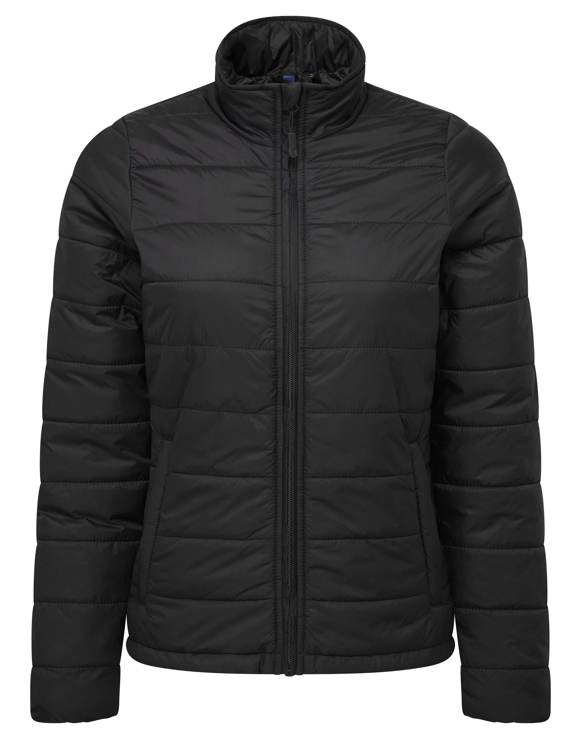 Womens padded zip-through jacket with horizontal stitching to form baffles, ensuring an even distribution of insulation. Covered zip with chin guard and zip guard to the inner. Styled with a cadet collar. Two welt jet zipped side pockets with a single open pocket to the inner for handy storage. Elasticated cuffs measuring one inch wide. Full embroidery access to the entire jacket through an internal zip in the lining. Lightweight and folds downs easily into its own stuff sack. Certified amfori BSCI.