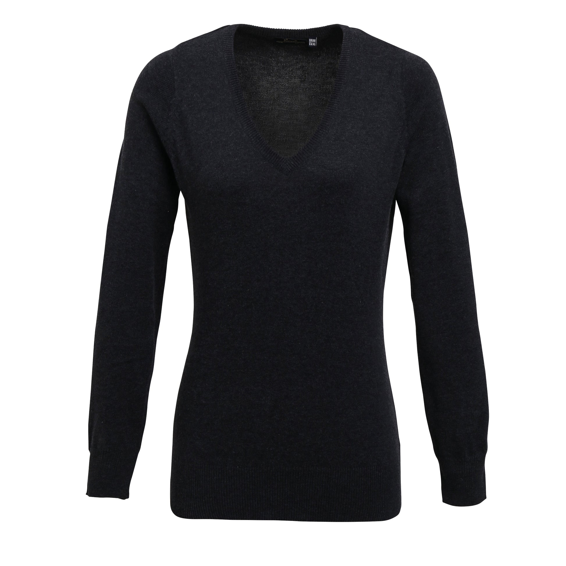 Women's long sleeve v-neck jumper. Soft feel/cotton rich yarn. Fine gauge knit. Contemporary styling. Set in sleeves. WRAP certified. BSCI certified. Reach certified.