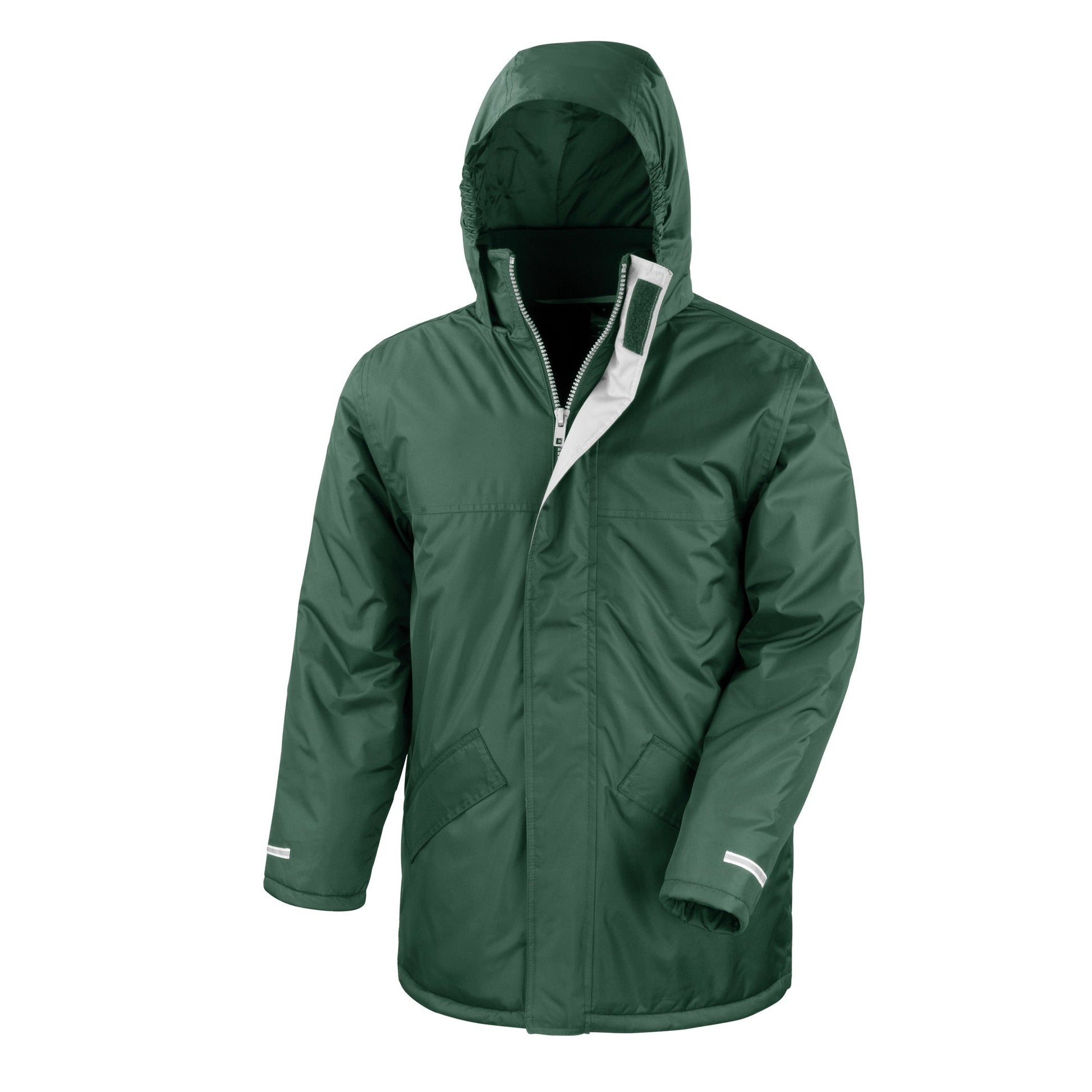 Waterproof-StormDri 2000. Windproof. Fully taped waterproof seams. Long fit. Super warm. Concealed 3-panel hood in collar. Full front heavy duty zip. 2 concealed front pockets with storm cover. Super warm fleece-lined collar. Reflective cuff and back detail. Name and class tag inside left pocket. Fleece-lined front pockets. Adjustable drawcord hem. Ready to brand cut away label. Oeko-Tex certified. Decorating methods: Embroidery, direct print, digital transfer print and screen print transfer. Decorators access point: Full hem and left chest.