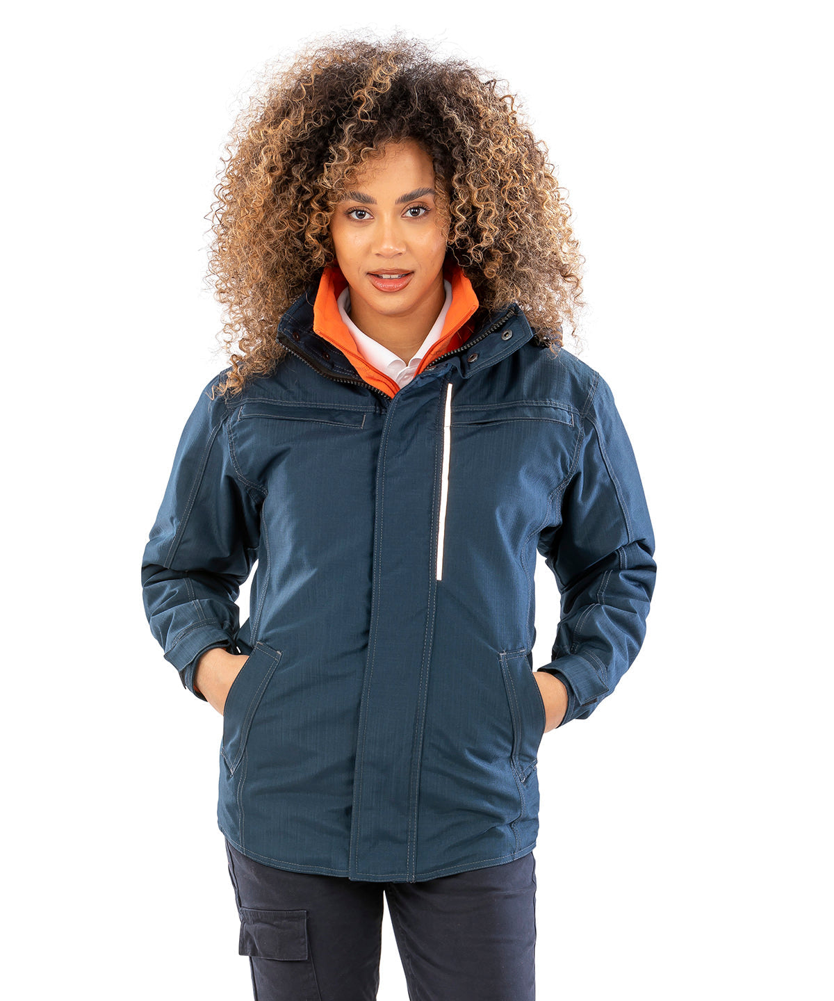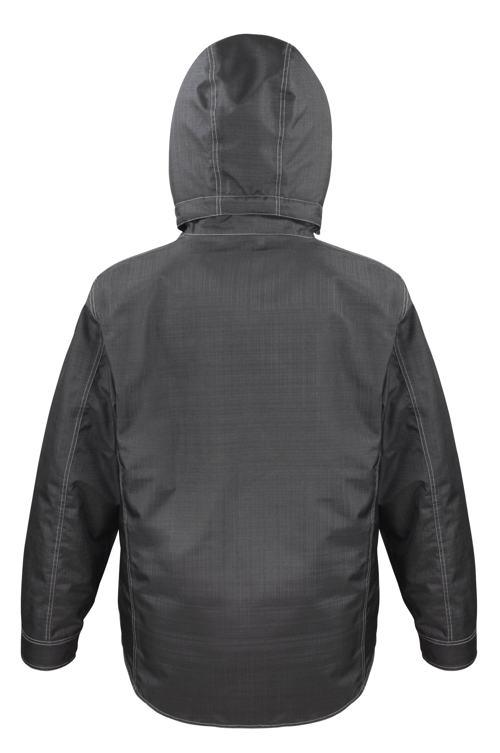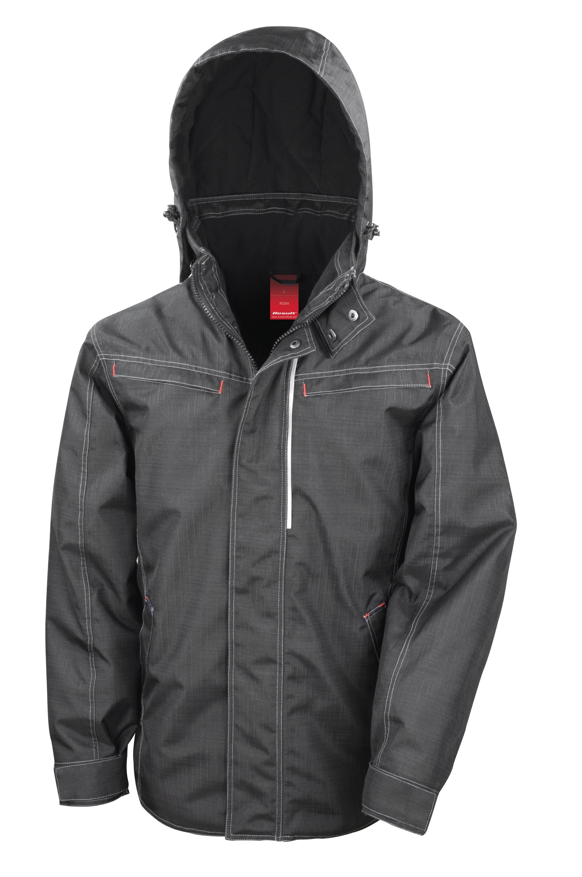 Tech: Waterproof 3000mm, Breathable 2000g, Windproof. Contrast twin needle stitching and bar tacks. Fashion shaped longer back panel. 4 outer and 2 inner zipped pockets. Quilted par-fleece lined. Stud closing storm flap. D-ring in LBP pocket. Tear release cuff. Removable hood. Taped seams. Reflective detail. Adjustable hem. Stand up collar. Hangtag. Rugged look. Hardwearing. Ready to brand – tag free. Corporate managers jacket styling.