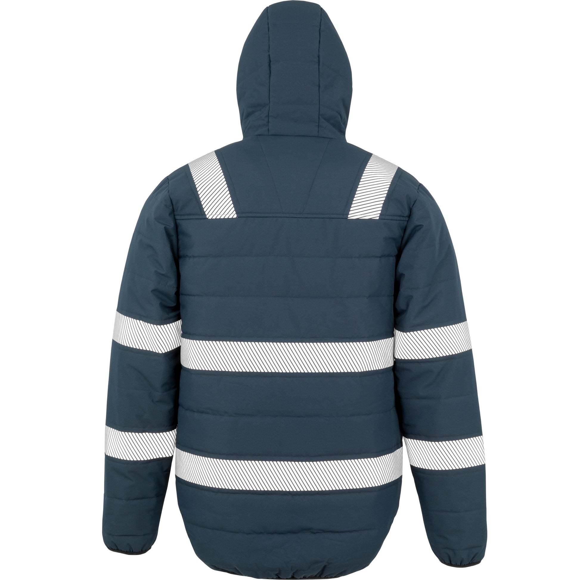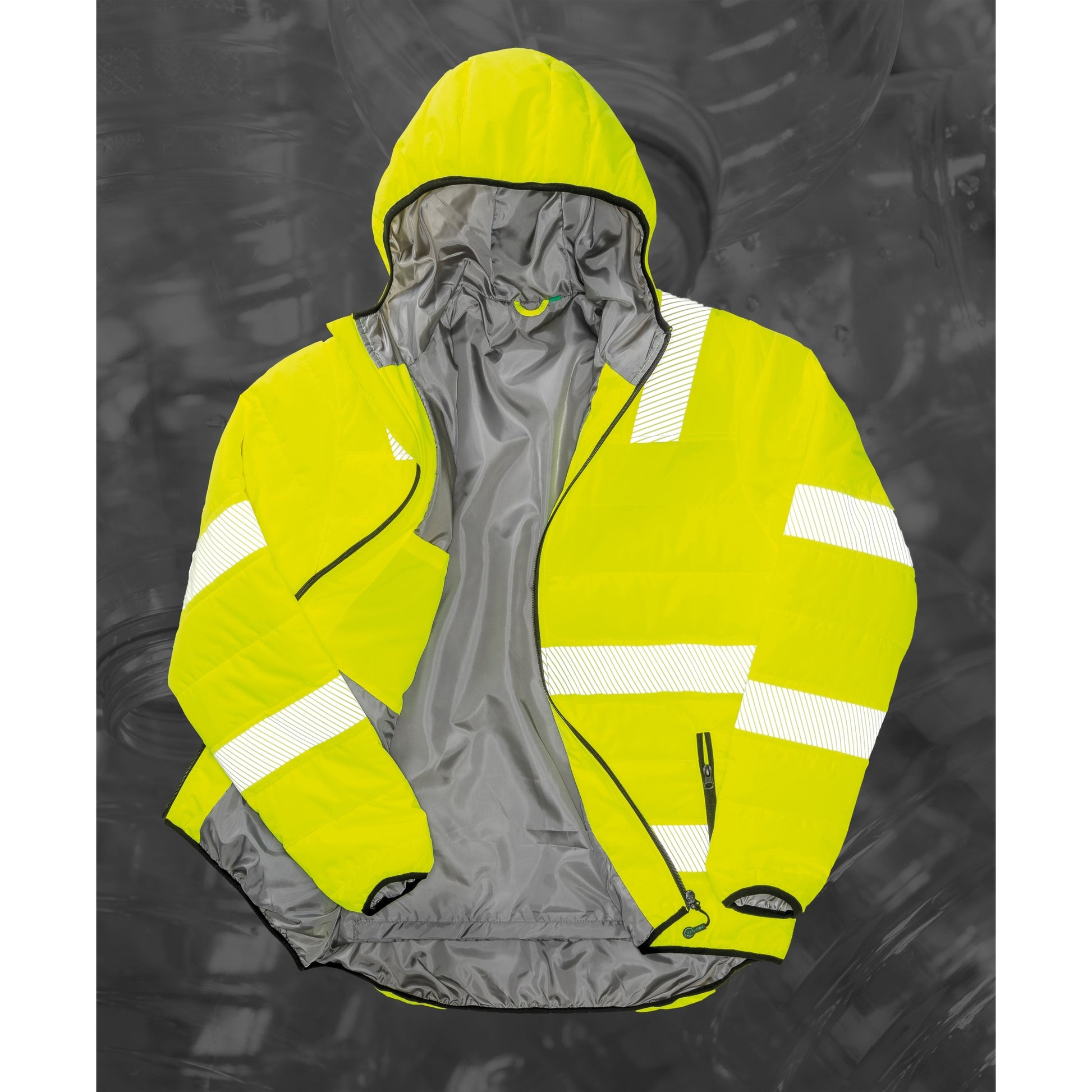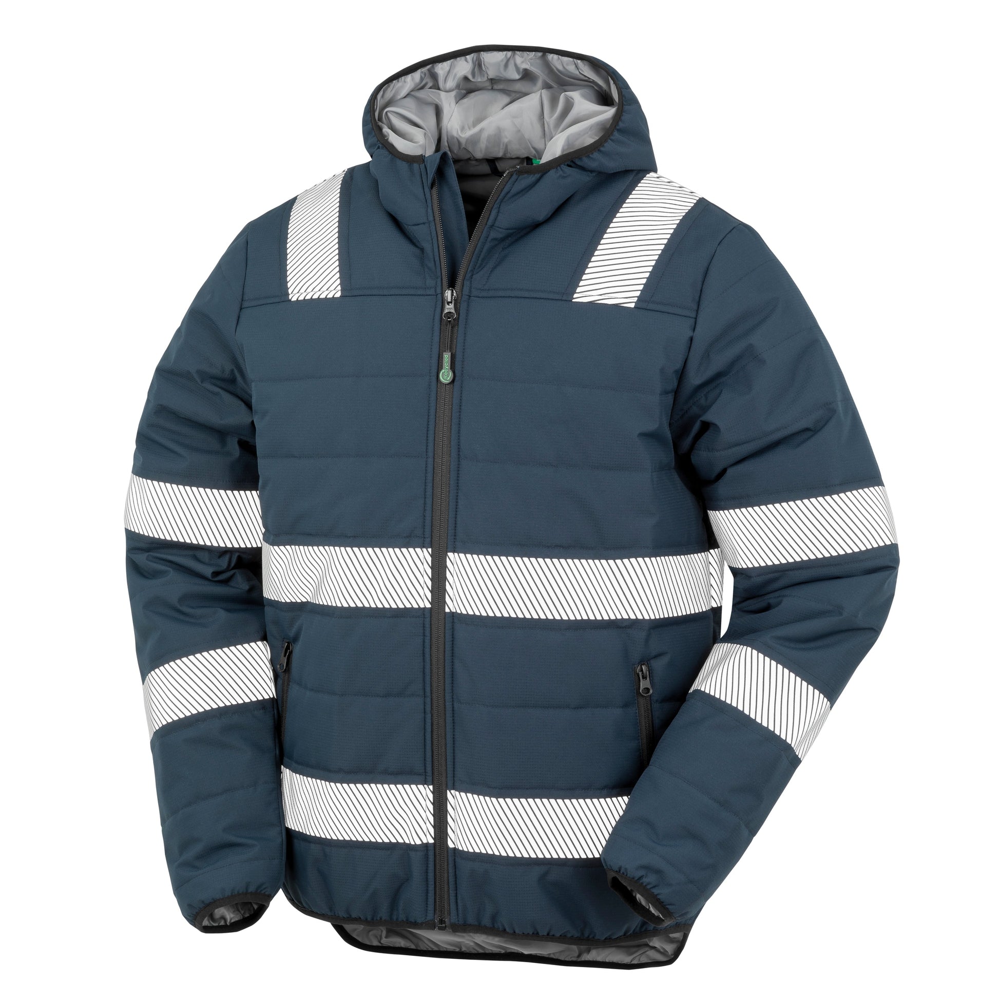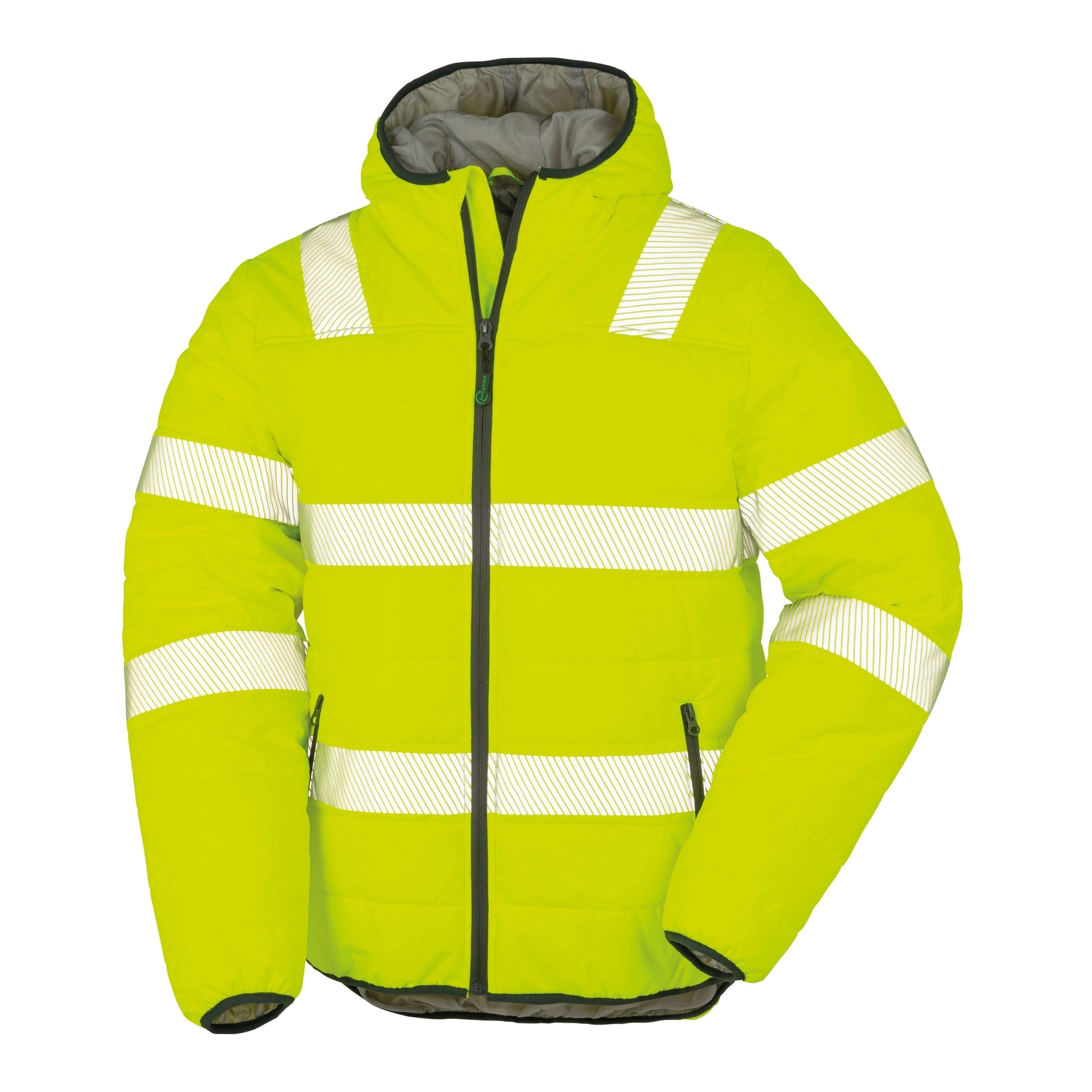Tough, warm and recycled: a padded printable, hooded safety jacket in water-repellent finish.