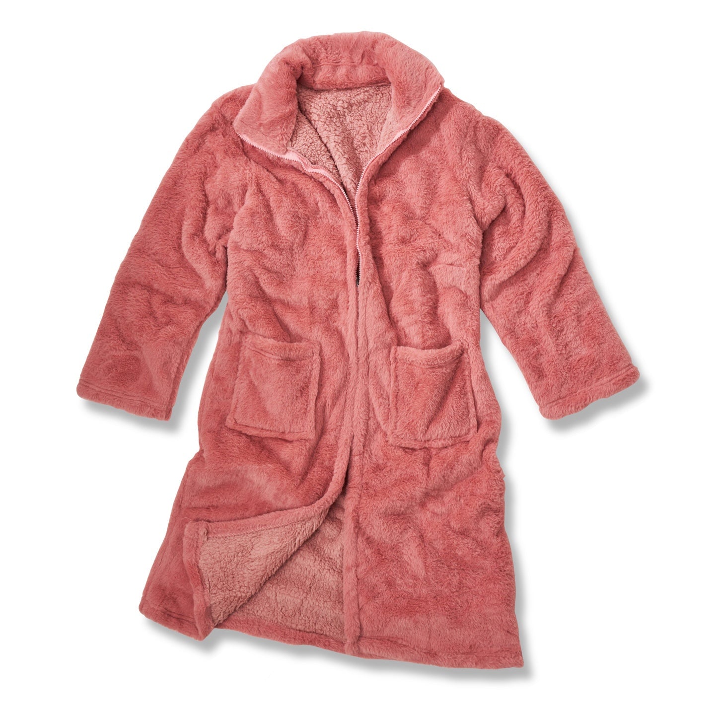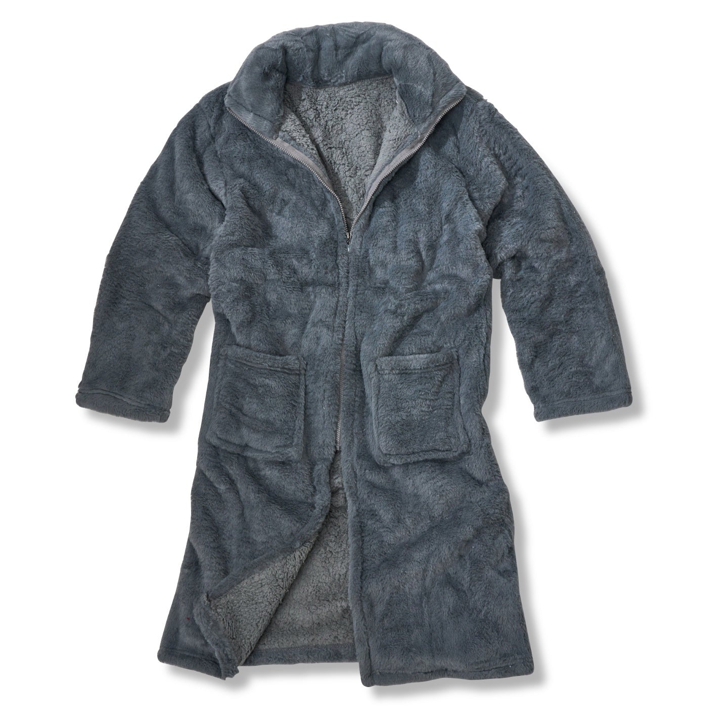 Cosy up and get comfy with this luxurious faux fur gown, with a snuggly warm sherpa lining and front zip fastening. Say goodbye to the cold days and nights in this oversized, one size fits most gown, with two large pockets to keep your hands warm too!