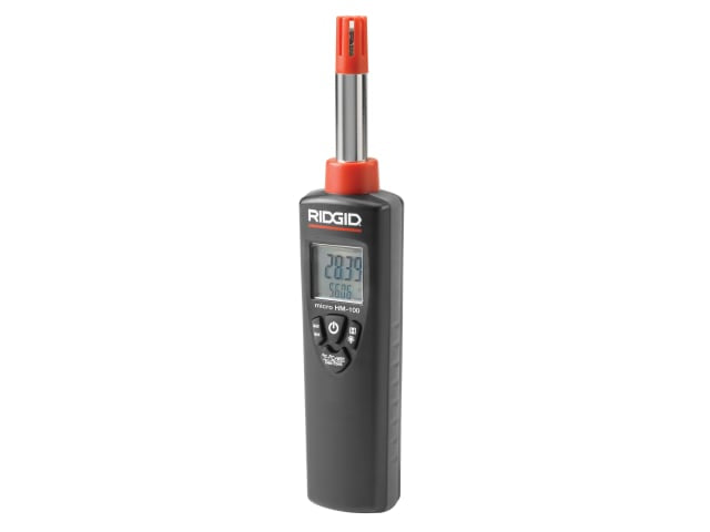 The Ridgid HM-100 Micro Humidity and Temperature Meter is a professional and easy to use device for accurately measuring air humidity and temperature. Both measured values (%RH and °C or °F) are instantly and simultaneously displayed on the dual backlit LCD.