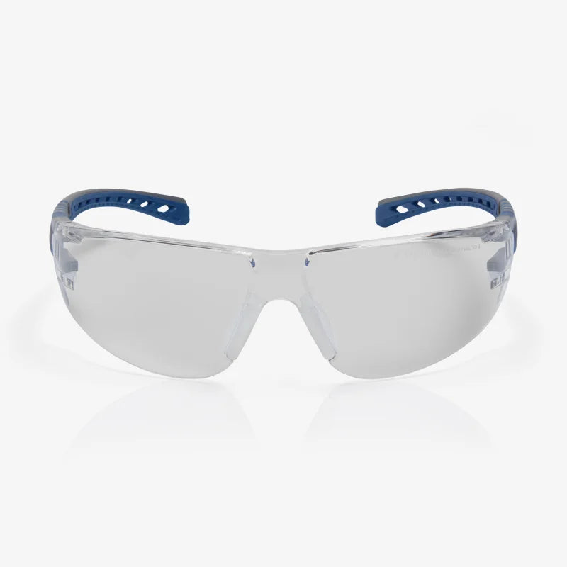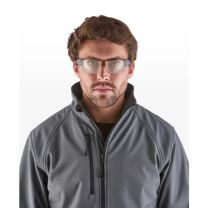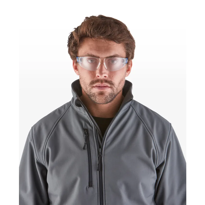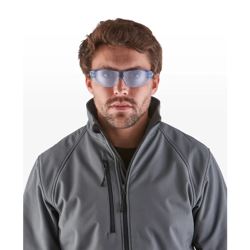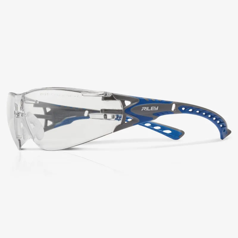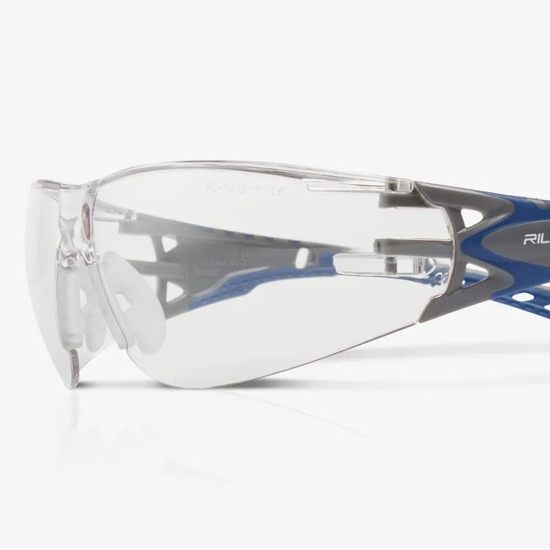 Riley Stream Evo, a lightweight sports-style safety spectacle with a secure & comfortable fit that comes in a range of lens types & coatings. The frameless design features an adjustable rubber nose bridge & flexible temple tips. Its wraparound polycarbonate lens offers a wide field of vision & lateral protection & is treated with our Tecton 4 anti-scratch anti-fog coating. The metal-free construction enhances safety, particularly during electrical work, while the slim temples ensure comfort with ear defenders. Ideal for manufacturing, engineering, DIY, construction, & warehouse & logistics industries. Recommended for electrical engineering, maintenance & servicing, & fabrication. Very lightweight at an impressive just 23g, & comes with a microfiber storage pouch. Stay protected with Riley Stream.