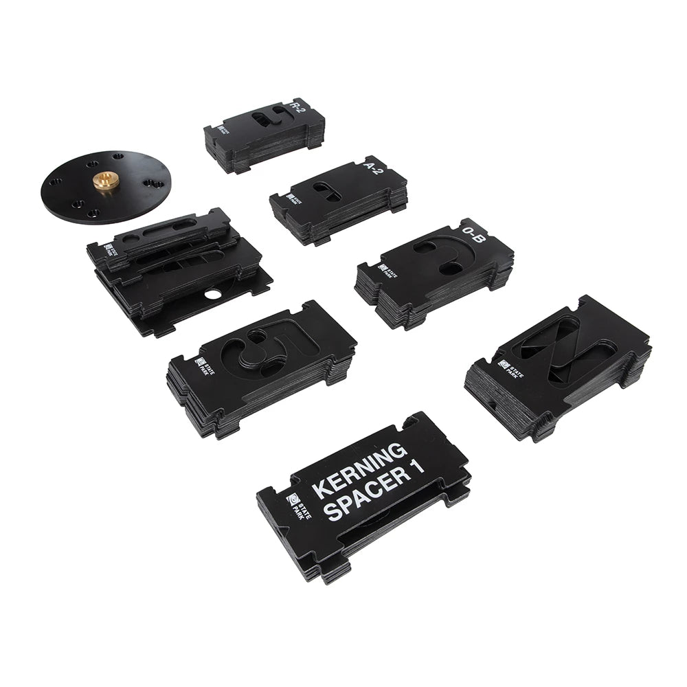 Produces professional signs using templates and a router. Templates interlock and are mounted using painter tape. Adjustable kerning allows neat, even spacing between letters. Includes 99 template pieces including letters, numbers, symbols, and kerning spacers. Also includes a high-quality brass guide bushing and a universal router base to fit all Triton routers. Template thickness 2mm (3/32"). Available in 1-1/2", 2-1/4" and 3-3/8" sizes. Compatible with Rockler Sign Router Bits (sold separately), as follows: 1-1/2” compatible with 3/16” Sign Router Bit, 2-1/4” compatible with 3/8” Sign Router Bit, 3-3/8” compatible with 5/8” Sign Router Bit.