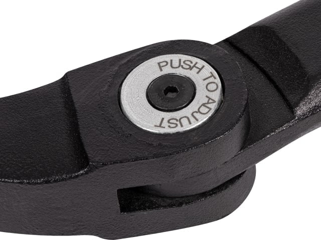 Roughneck® Gorilla Bar with an 180° adjustable claw rotation. This enables the optimal angle for maximum leverage at all times. The angle is easily adjusted by the push button which locks in up to 10 different positions. Drop forged and heat treated for exceptional strength and durability, oval profile further enhances structural strength and offers enhanced grip and comfort. Wide low profile jaws for easier penetration and more effective prying. Powder coated finish and polished tips offer greater resistance to corrosion. With bevelled nail remover for prying embedded nails and chisel end for breaking up concrete and brick.