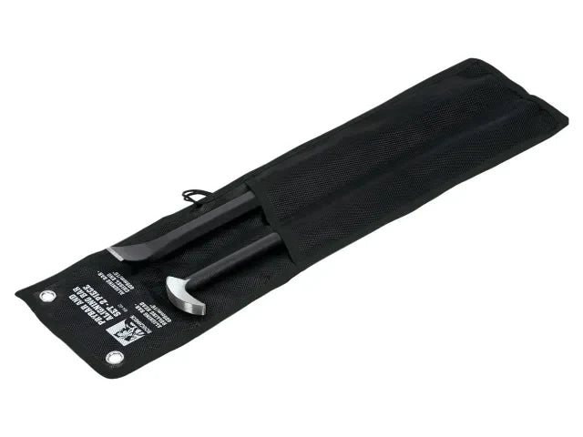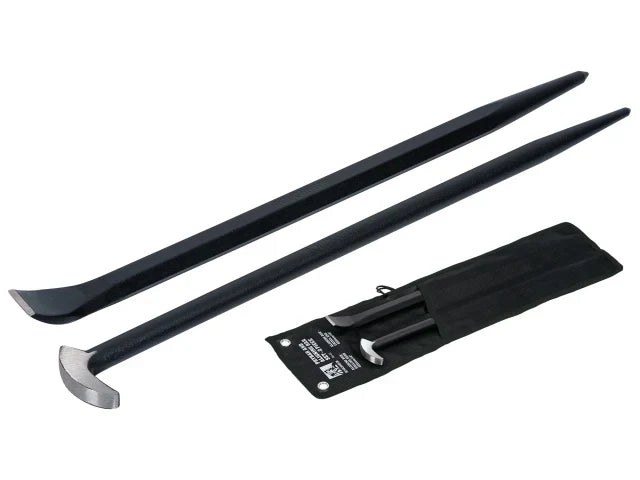 The Roughneck Automotive Bar Set contains one rolling head with a round shank and one aligning bar with a hexagonal shank. Both bars are made from one piece of heat-treated steel. They have a black finish with polished double ends. Bevelled edge for easy use.