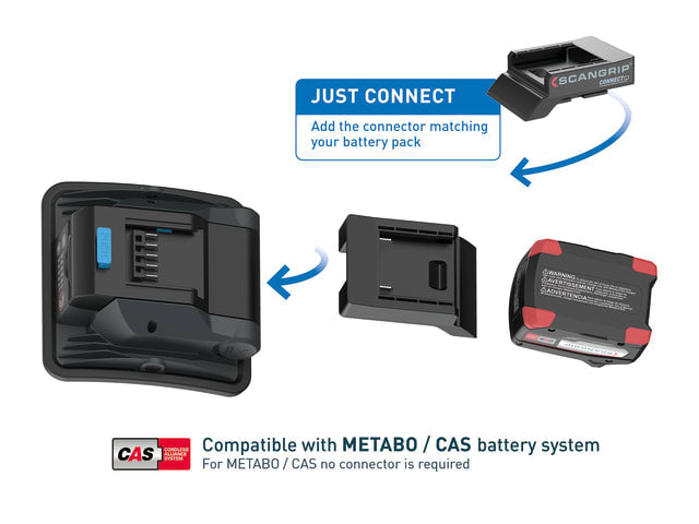 -An 18V battery from a leading power tool brand, such as Milwaukee, DeWalt, Makita, etc., by using the SCANGRIP® CONNECT CONNECTOR.
