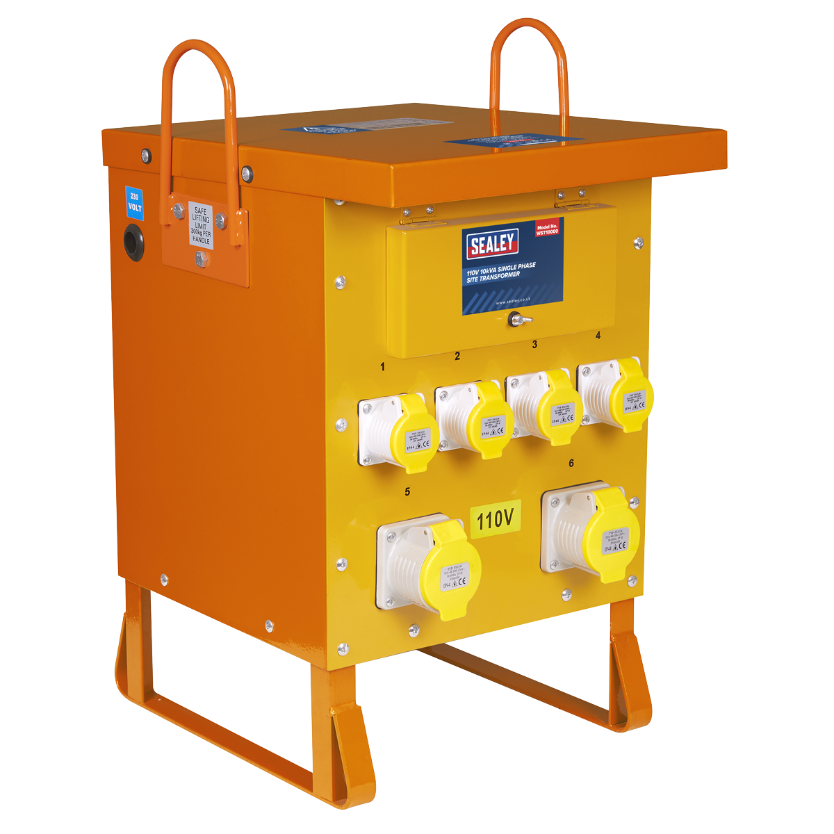 110V Transformer with tool rated performance suitable for intermittent running of power tools and continuous running of lighting products within specified capacity. IP44 Rated unit with steel case and heavy-duty handles to aid positioning. Fitted with miniature circuit breaker to prevent overload. Supplied with 2 x 32A/110V sockets and 4 x 16A/110V sockets. • Site transformer produces a max. output of 10kVA and is designed to be used with a single phase 230V supply.