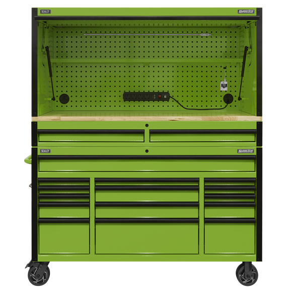 • Hutch style top chest features gas struts, single full-length powder coated shelf and pegboard back for easy tool storage. Pegboard is compatible with all Sealey TTS hooks.