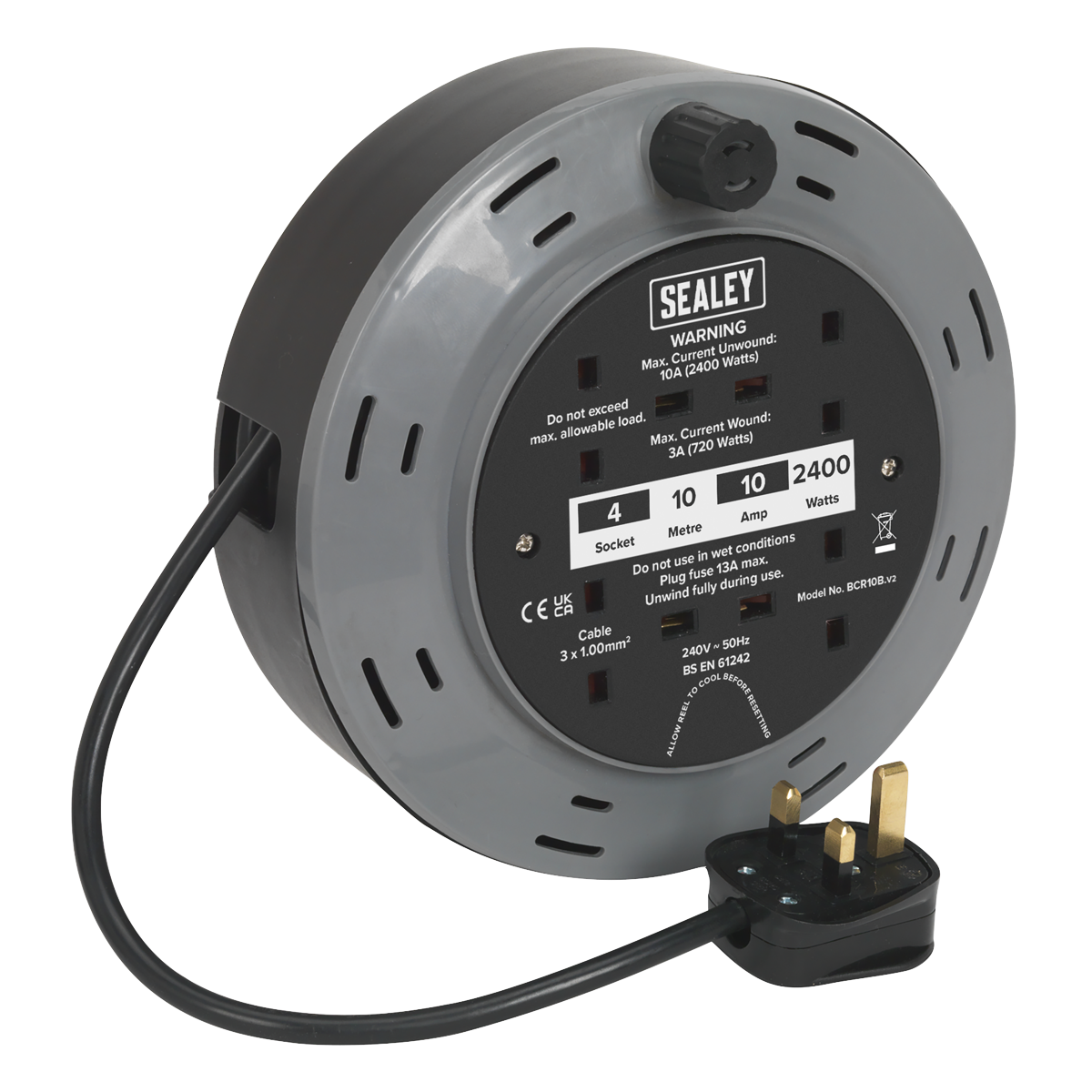Sealey Cassette Type Cable Reel 10m 4 x 230V 1.00mm² Thermal Trip