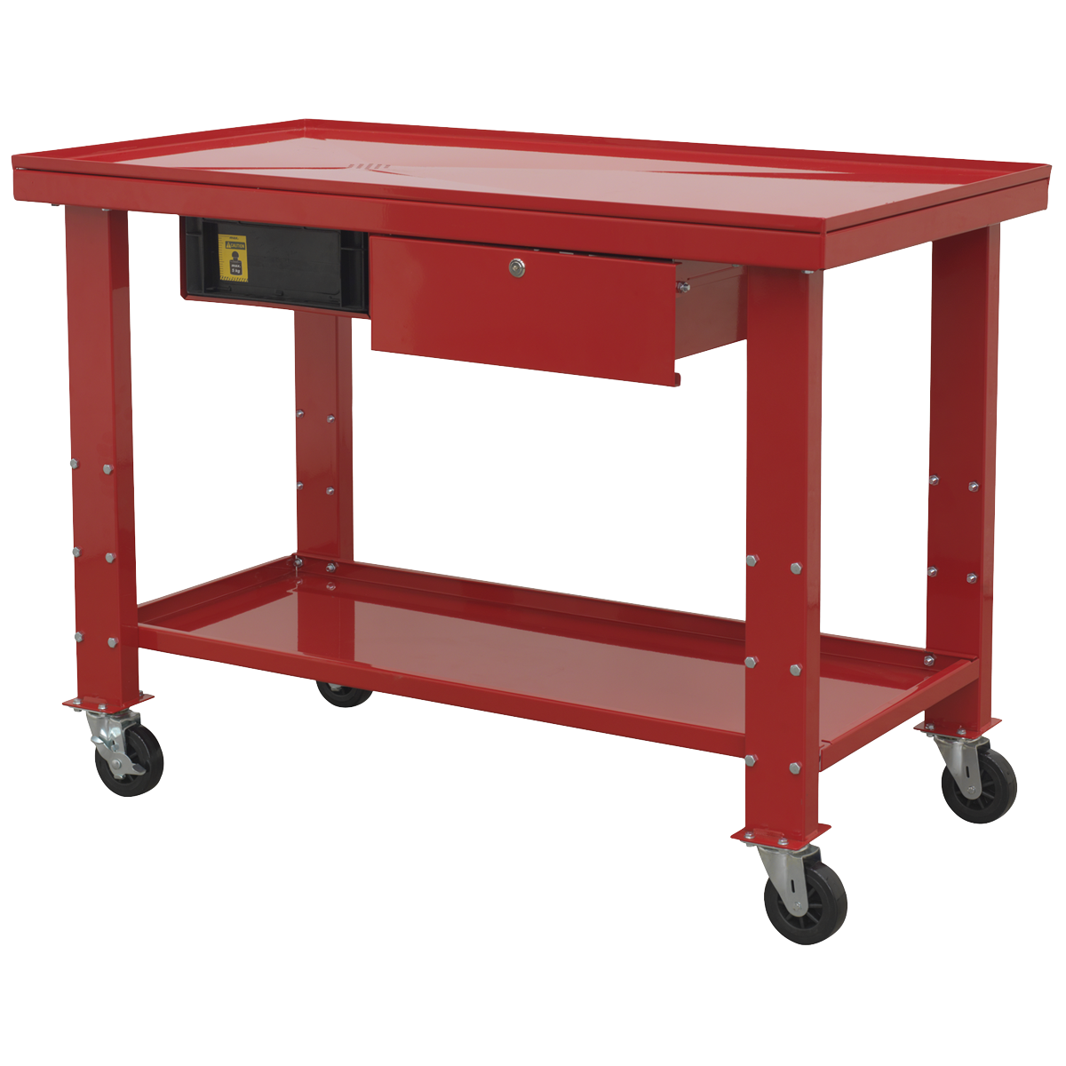 • Features height-adjustable bottom shelf ideal for parts and tool storage, a lockable drawer and four swivel castors, two of which are locking.