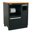 • Heavy-duty multifunction modular cabinet includes rubbish bin, paper roll holder and a deep drawer.